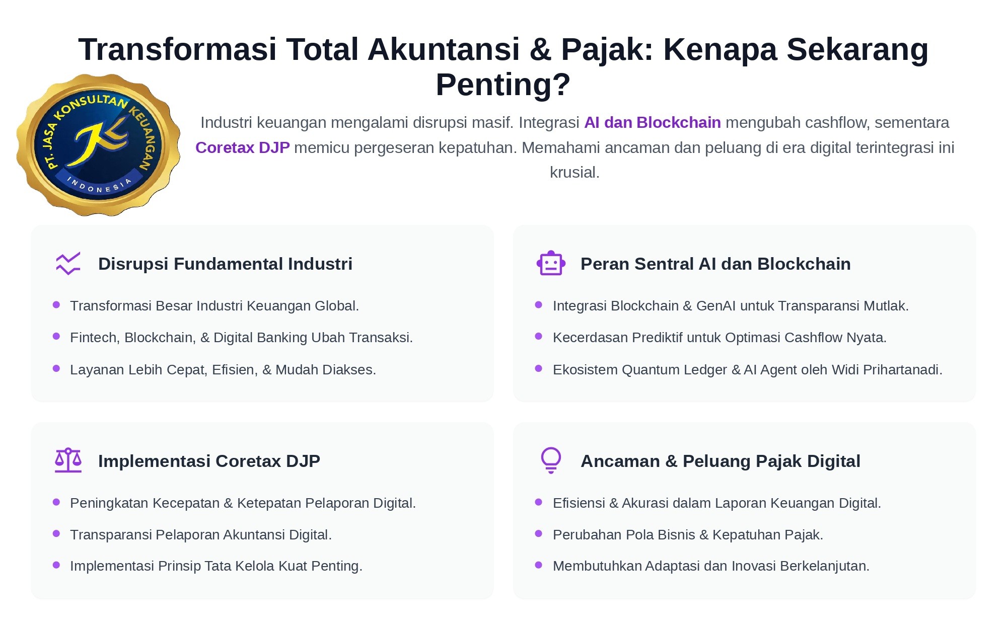 Coretax DJP bukan lagi wacana; ia adalah realitas yang harus dihadapi setiap perusahaan. Mereka yang mampu mengintegrasikan sistem akuntansi dengan teknologi mutakhir seperti blockchain dan AI akan meraih keunggulan kompetitif: kepatuhan tanpa beban, risiko minimal, dan efisiensi biaya.