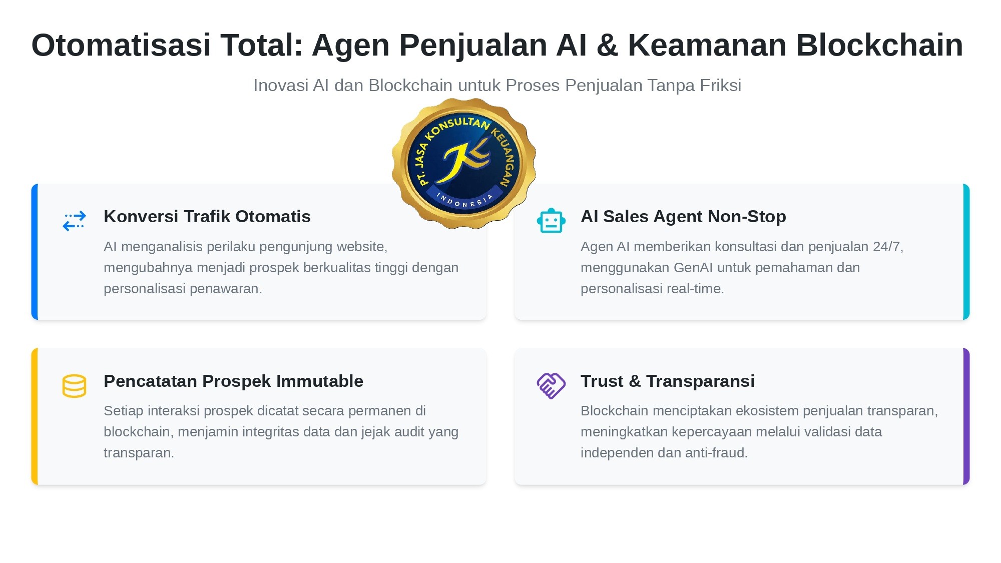 Dengan ini, seluruh trafik website akan dikonversi menjadi prospek dan penjualan otomatis 24/7, didukung oleh AI dan diamankan oleh Blockchain, sesuai visi Widi Prihartanadi.