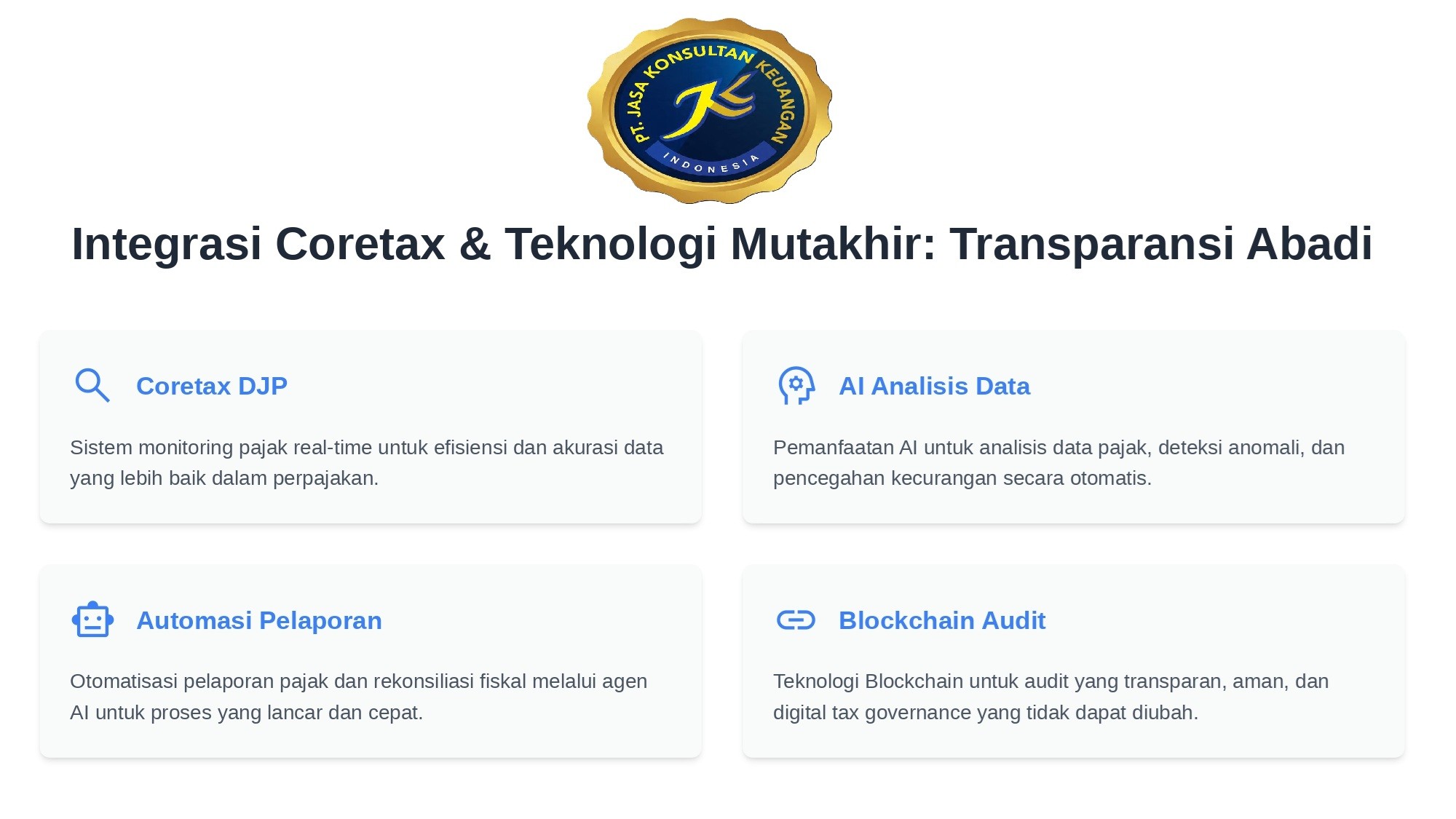 PT Jasa Konsultan Keuangan, dengan pengalaman lebih dari satu dekade dalam konsultasi pajak dan keuangan, kini diperkuat oleh tim ahli teknologi digital. Kami percaya bahwa kepatuhan pajak bukan sekadar kewajiban, melainkan fondasi pertumbuhan bisnis yang berkelanjutan.